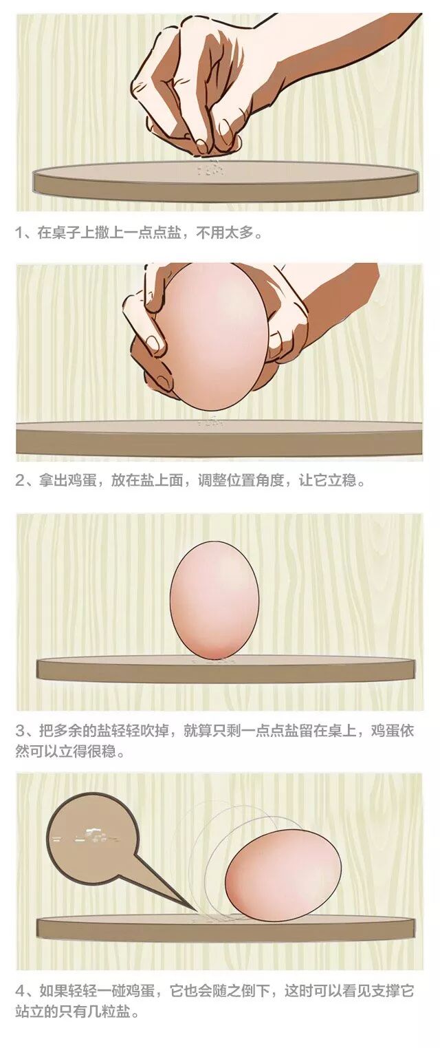 立蛋也是有技巧的, 首先是选蛋, 最好选新鲜的生鸡蛋,越新鲜越好, 因为蛋清蛋黄之间略带松弛, 蛋黄稍有些下沉, 鸡蛋重心降低, 有利于鸡蛋的竖立.